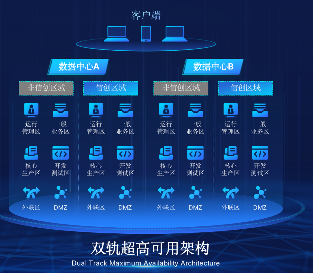 BB贝博艾弗森在企业面临自主创新IT基础重构过程中,推出的全新架构双轨超高可用架构(简称DTMAA),在双活数据中心的分区调度基础上,添加每个数据中心内信创域和非信创域的分域调度,来实现分区分域协同的多活双轨超高可用。