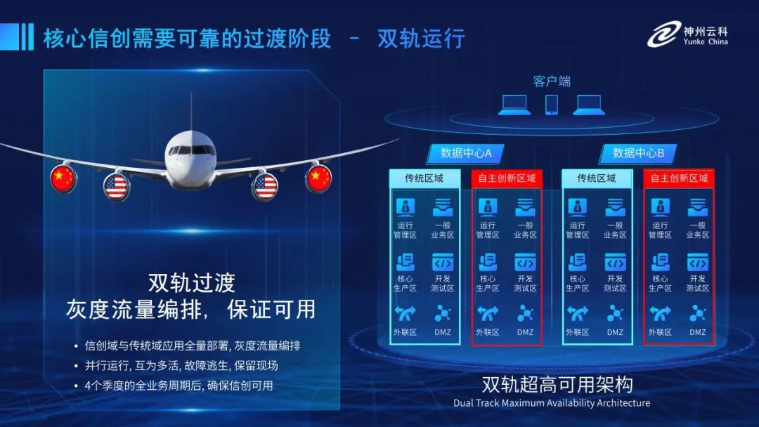 为帮助客户更好地应对数字经济时代对应用可持续性的高要求,实现信创与数字化兼得,BB贝博艾弗森推出了双轨超高可用架构。双轨超高可用架构在双活数据中心的分区调度基础上,增加信创域和非信创域的分域调度,实行信创域与传统域应用全量部署,使双中心运营变为双中心四区域并行运行,互为多活,将传统架构变为分区分域协同的多活双轨超高可用架构。帮助客户在新架构下,保障“信创”的同时解决性能瓶颈,提升稳定性,保证应用可持续性,最终实现信创区域和非信创区域的平滑过渡,完成国产化替代目标。”
