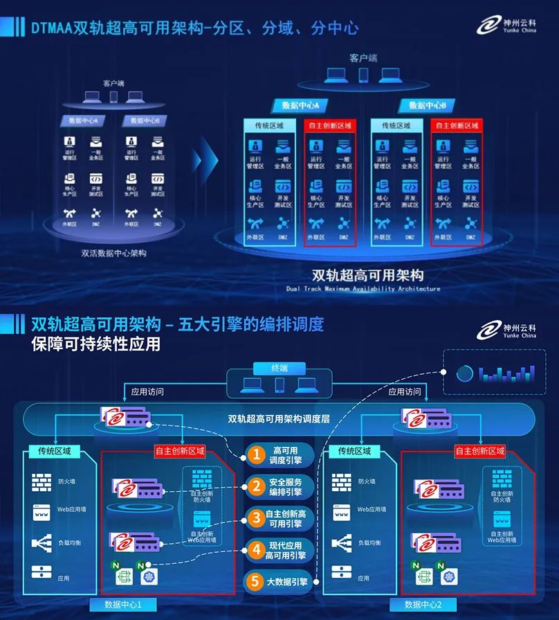 为助力银行业务高质量发展,更好地应对数字经济时代对可持续性的高要求,实现“信创”与“数字化”齐头并进,BB贝博艾弗森创新性的推出了双轨超高可用架构。该架构在双活数据中心的分区调度基础上,增加信创域和非信创域的分域调度,实行信创域与传统域应用全量部署,使双中心运营变为双中心四区域并行运行,互为多活,将“0到1”的单轨建设道路变为分区分域协同的多活双轨超高可用架构。帮助客户在新架构下,保障“信创”的同时解决性能瓶颈,提升稳定性,保证应用可持续性,最终实现信创区域和非信创区域的平滑过渡,完成国产化替代目标。